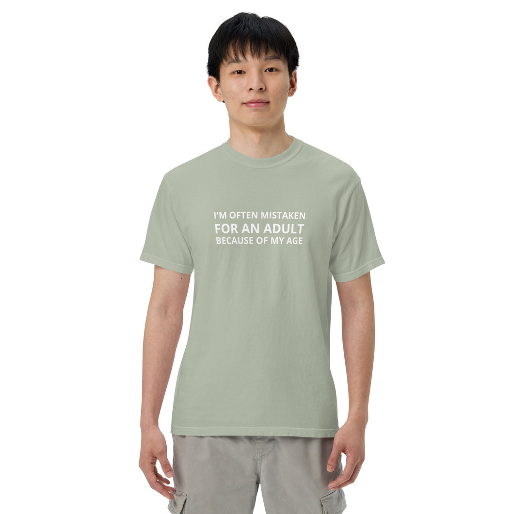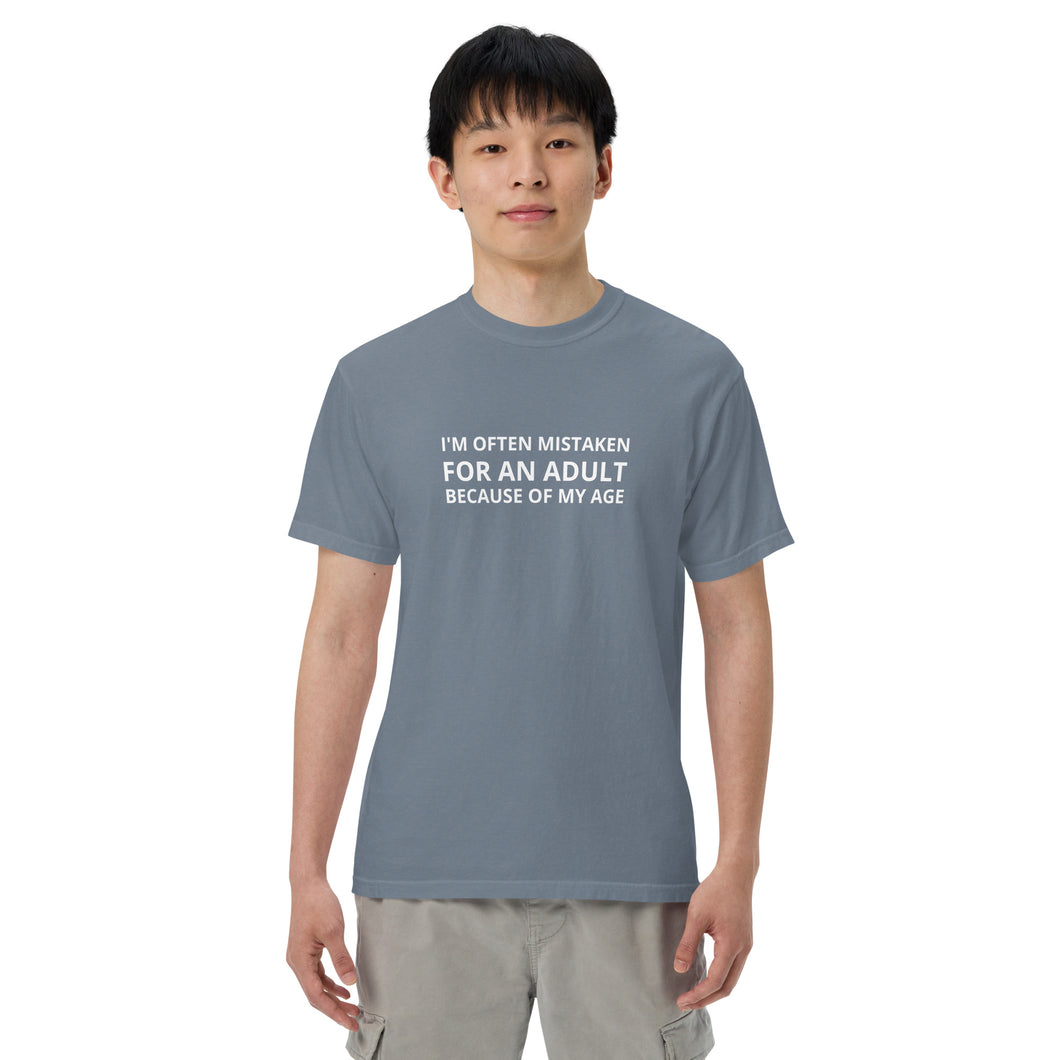 "I'm often mistaken for an adult because of my age" Unisex garment-dyed heavyweight t-shirt in Various Colors with White Logo