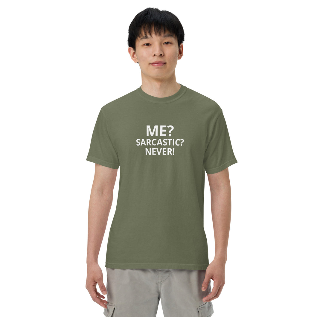 "ME? SARCASTIC? NEVER!" Unisex garment-dyed heavyweight t-shirt in Various Colors with White Logo