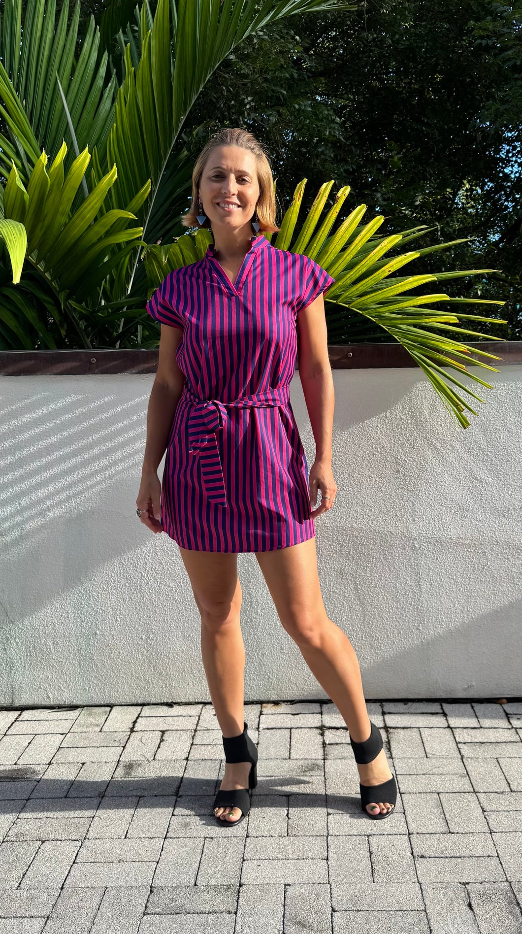 Short Sleeve Belted Navy and Purple Striped Ladies Mini Dress in Size Small