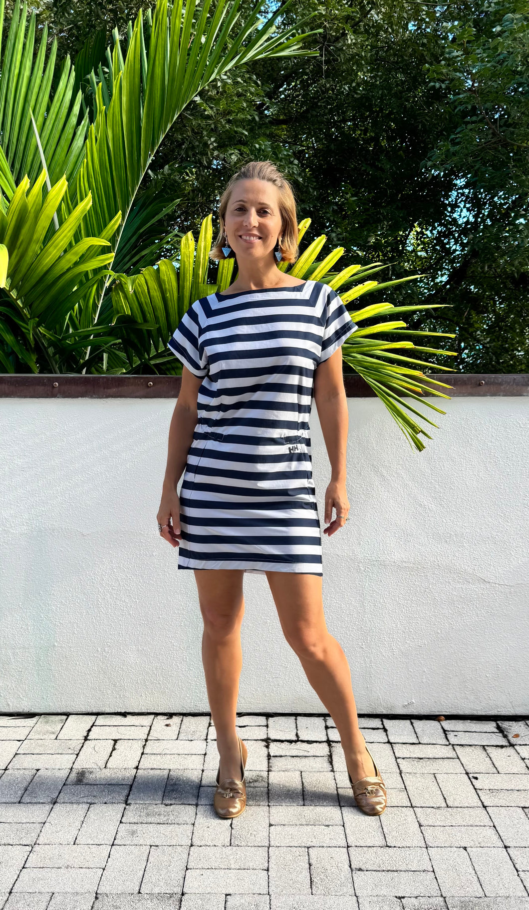 Short Sleeve Navy and White Striped Ladies Mini Dress in Size Small
