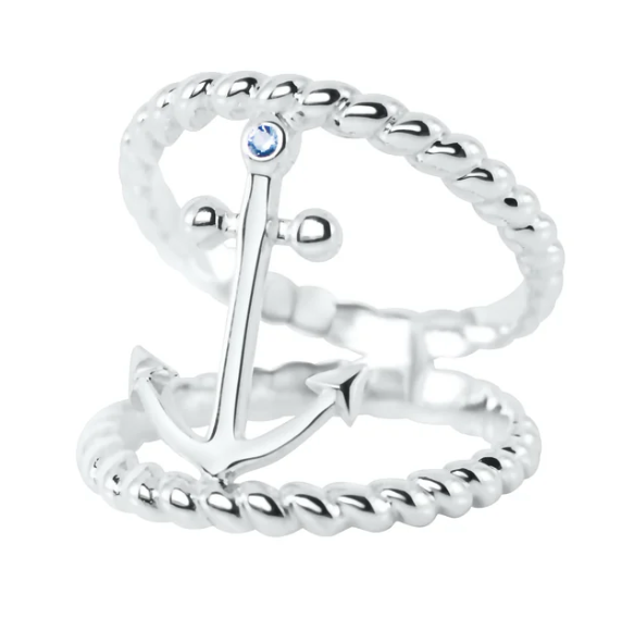 Introducing our stunning Anchor Double Rope Ring, featuring an intricately crafted anchor design set between two bands. Made in Sterling Silver with Rhodium, this ring is both elegant and durable. The blue stone is a nod to the beauty of tropical waters and adds a touch of color to this classic design.